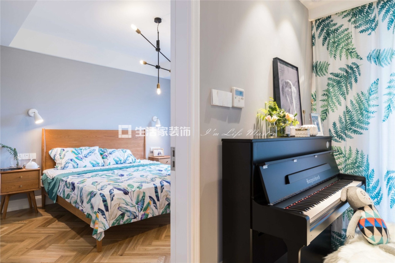 主卧室及主卫:卧室空间不大 衣柜空间不够 卧室的阳台门在床头 柜子采用嵌入式设计 通往阳台的门采用床头背景隐形推拉门设计。